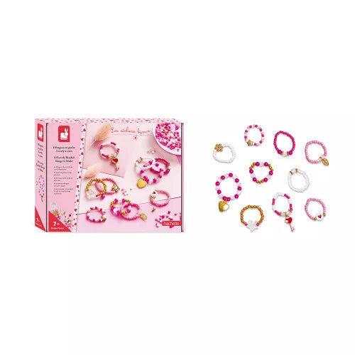 Créez d'adorables bijoux ! Avec ce kit créatif, les enfants de 7 ans et plus réalisent 10 bagues en perles dans un style adorable. Du rose, du doré, des cœurs, des étoiles … Pour un rendu vraiment romantique ! Cette activité de création de bijoux en perles est idéale pour stimuler la dextérité des enfants et leur permettre d'exprimer leur créativité. Et quel plaisir de porter fièrement ses propres bijoux faits main ! Sur tous les doigts, en accumulation ... C'est une véritable vague de glamour ! L'atout de ce coffret créatif, c'est le fil élastique : idéal pour que les bagues puissent être portées à tous les doigts et facilement enfilées ou retirées. Complet, cet atelier bijoux propose également une coupelle très pratique pour manipuler facilement les perles sans risquer de les perdre. Ce coffret de loisir créatif contient : 300 perles de rocaille, 40 perles dorées, 16 perles à facettes transparentes, 15 perles irisées roses, 6 perles intercalaires, 3 breloques, 2 perles étoiles, 1 perle imprimée cœur, du fil élastique et 1 coupelle. Pour guider les enfants dans la création de leurs charmantes bagues, un livret avec modèles et instructions et également inclus. Il faudra compter environ 10 minutes pour créer chaque bague.