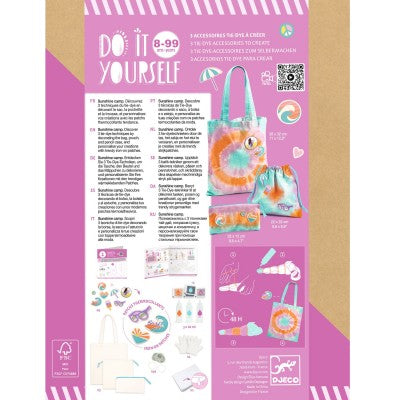 Un kit créatif pour découvrir la teinture tie-dye, ses dégradés uniques, et réaliser différents motifs comme un designer textile. Pour cela, l’enfant va se laisser guider et apprendre à nouer (« tie ») les accessoires en tissu et à les teindre (« dye ») à l’aide des colorants fournis, selon 3 différentes techniques de création de motifs : motifs circulaires, géométriques et en lignes. Une fois secs, les accessoires peuvent être personnalisés grâce aux écussons thermocollants fournis. Chaque création est unique !