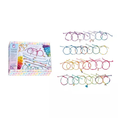 Ornez vos poignets de vos plus beaux bracelets ! Avec ce kit créatif, les enfants dès 8 ans réalisent 30 bracelets enroulés aux couleurs de l'arc-en-ciel. Fabriquer ses propres bijoux n'a jamais été aussi facile, d'autant plus qu'un livret avec modèles et instructions est inclus pour guider les petits créatifs ! Avec leur kit de fabrication de bracelets, les enfants développent leur sens de la créativité et leur dextérité, ils expriment aussi leur personnalité en assemblant soigneusement les fils colorés et en choisissant la breloque la mieux assortie. Le coffret créatif contient : 12 échevettes de fil de coton de 17 mètres, 6 breloques (soleil, arc-en-ciel, nuage, parapluie, étoile filante, éclair), 2 pompons, 10 anneaux de raccord et 1 pince. Une fois réalisés, les bracelets sont prêts à être portés avec fierté ou offerts tels des bracelets de l'amitié : avec 30 bracelets au total, il y a de quoi satisfaire tous les amoureux des bijoux ! L'autre atout de ce loisir créatif, c'est sa boîte réutilisable comme boîte à bijoux, ce qui permet de bien ranger tous les bracelets confectionnés et même ceux en cours de réalisation. Il faut compter environ 15 minutes pour réaliser chaque bracelet : soit 7h30 min environ pour créer tous les bijoux proposés dans le coffret. Voilà une activité créative et récréative qui fera toujours plaisir comme cadeau d'anniversaire