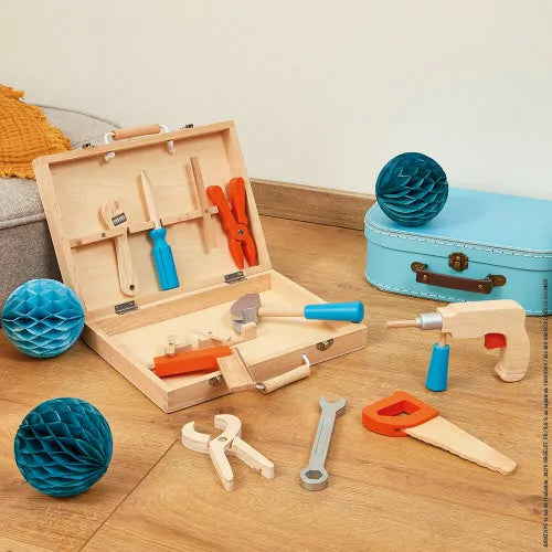 Passe moi la clé à molette ! Parce que papa et maman font des travaux à la maison ou aiment bricoler de temps en temps, vous avez peut-être remarqué que votre enfant voulait vous imiter et vous aider à sa manière ? Cette boite à outils contient tout le matériel dont votre enfant aura besoin pour faire comme les grands en toute sécurité ! Cette mallette du bricoleur en bois contient 9 outils : un marteau, un tournevis plat, une perceuse, une scie, une clé à molette, une clé plate, une règle, 2 pinces. Grâce à sa mallette facile à transporter, les enfants à partir de 3 ans pourront amener ses beaux outils sur tous leurs chantiers préférés !