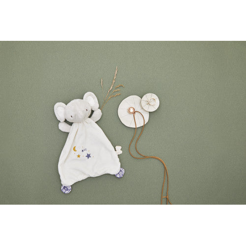 Un coffret naissance à offrir dès la grossesse ! Sur le thème de la comptine « Brille, brille petite étoile », il se compose d’un magnifique collier bola pour la maman et d’un charmant doudou éléphant avec bola intégré dans la tête pour bébé. Dès la grossesse, rassurez et éveillez bébé aux sons en optant pour ce bijou traditionnel originaire d’Indonésie et d’Amérique latine, également nommé « appel des anges ». Porté par les femmes enceintes, le bola est synonyme de protection pour la mère et l’enfant, de paix et d’harmonie, grâce au doux tintement qu’il émet. Dès les premiers instants in utéro de bébé, celui-ci sera réconforté par le son cristallin du bola roulant sur le ventre arrondi de sa mère. Le bola présent dans ce coffret mesure 45 à 70 cm de long et se compose d’un collier en suédine ainsi que d’un pendentif en laiton, couleur or rosé (diamètre 2 cm). À entreposer dans un endroit sec, entretien avec essuyage à sec en surface uniquement. À la naissance de bébé, il trouve alors réconfort grâce à son doudou éléphant qui produit le même son, ce qui créé un lien continu et un cocon de douceur. En plus d’être rassuré, bébé s’éveille aux sons dans un environnement stimulant et sécurisant. Le doudou éléphant mesure 24 cm, il est orné de broderies sur son ventre illustrant la comptine « Brille, brille petite étoile ». Les matériaux entrant dans la composition de ce doudou ont été choisis avec soin : 76% de matières recyclées, y compris le rembourrage. Le doudou éléphant peut être lavé en machine à 30°. L’ensemble de ces produits dédiés à l’apaisement et l’éveil de bébé sont présentés dans un joli coffret cadeau personnalisable, grâce à l’encart disponible sous le couvercle. Ce coffret bola et doudou éléphant fait partie de la collection Petites Chansons de Kaloo: une gamme dédiée à l’éveil aux sons, développée avec une équipe de psychomotriciens et composée d’une variété de sonorités pour stimuler bébé.