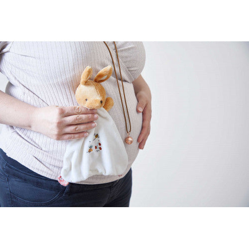 Le coffret naissance à offrir dès la grossesse ! Sur le thème de la comptine « Mon petit lapin », il se compose d’un magnifique collier bola pour la maman et d’un adorable doudou lapin avec bola intégré dans la tête pour bébé. Dès la grossesse, rassurez et éveillez bébé aux sons en optant pour ce bijou traditionnel originaire d’Indonésie et d’Amérique latine, également nommé « appel des anges ». Porté par les femmes enceintes, le bola est synonyme de protection pour la mère et l’enfant, de paix et d’harmonie, grâce au doux tintement qu’il émet. Dès les premiers instants in utéro de bébé, celui-ci sera réconforté par le son cristallin du bola roulant sur le ventre arrondi de sa mère. Le bola présent dans ce coffret mesure 45 à 70 cm de long et se compose d’un collier en suédine ainsi que d’un pendentif en laiton, couleur or rosé (diamètre 2 cm). À entreposer dans un endroit sec, entretien avec essuyage à sec en surface uniquement. À la naissance de bébé, il trouve alors réconfort grâce à son doudou lapin qui produit le même son, ce qui créé un lien continu et un cocon de douceur. En plus d’être rassuré, bébé s’éveille aux sons dans un environnement stimulant et sécurisant. Le doudou lapin mesure 24 cm, il est orné de broderies sur son ventre illustrant la comptine « Mon petit lapin ». Les matériaux entrant dans la composition de ce doudou ont été choisis avec soin : 76% de matières recyclées, y compris le rembourrage. Le doudou lapin peut être lavé en machine à 30°. L’ensemble de ces produits dédiés à l’apaisement et l’éveil de bébé sont présentés dans un joli coffret cadeau personnalisable, grâce à l’encart disponible sous le couvercle. Ce coffret bola et doudou lapin fait partie de la collection Petites Chansons de Kaloo: une gamme dédiée à l’éveil aux sons, développée avec une équipe de psychomotriciens et composée d’une variété de sonorités pour stimuler bébé.