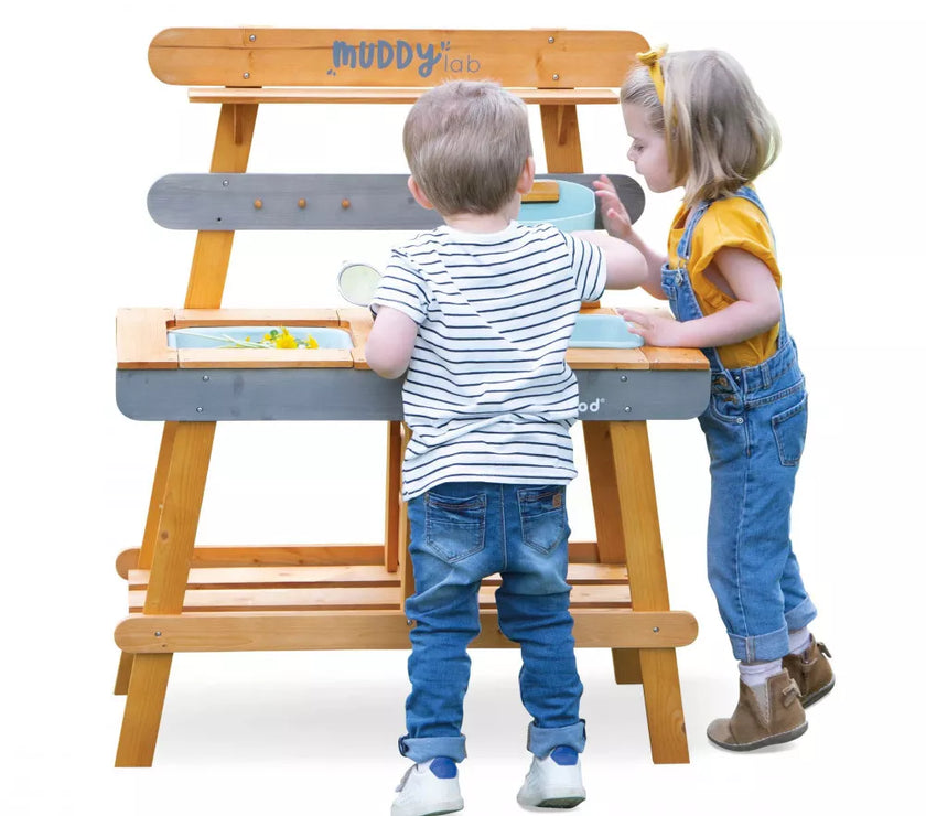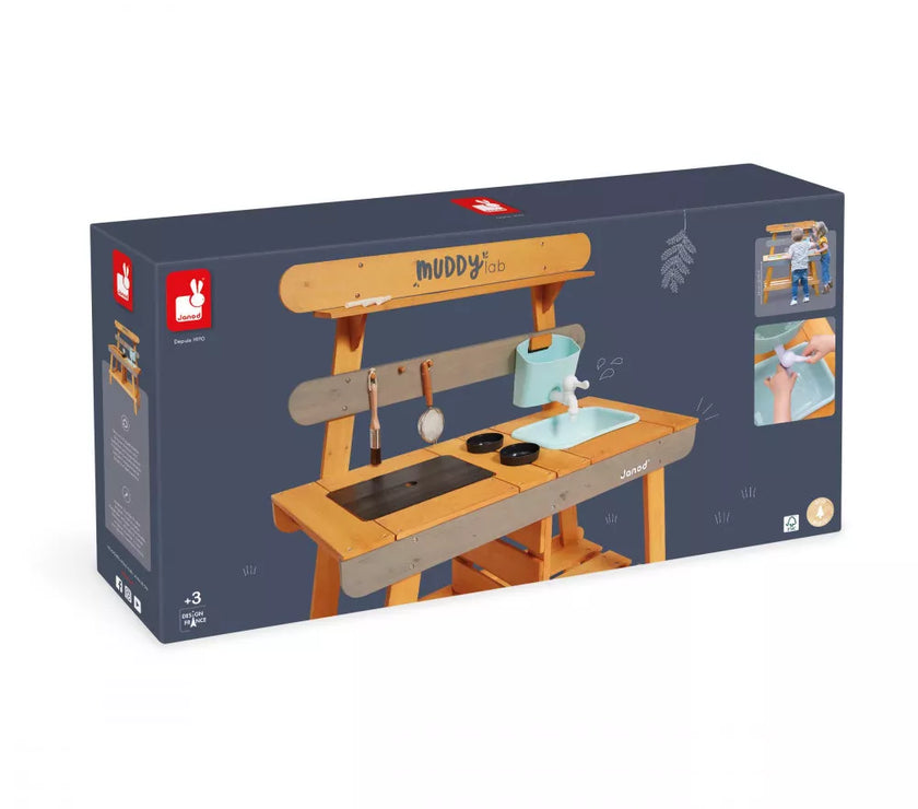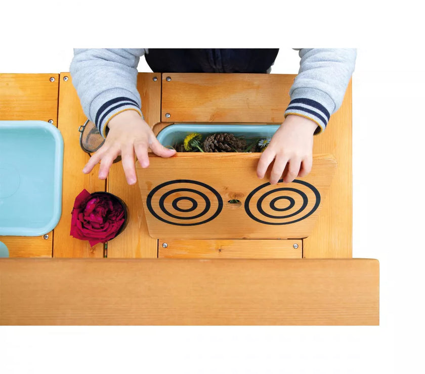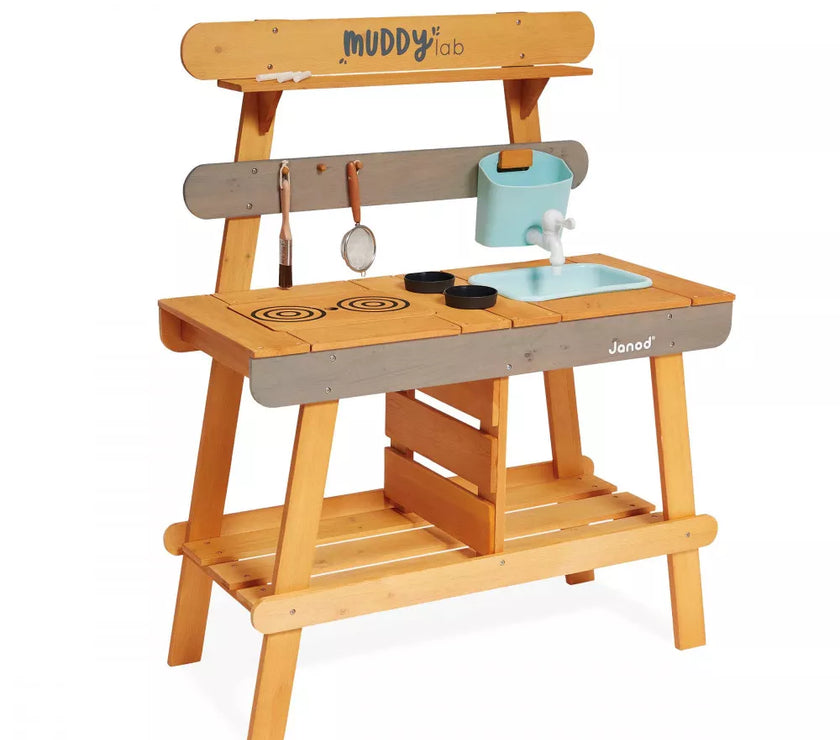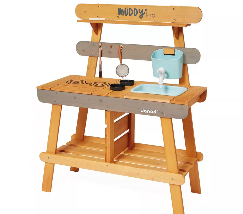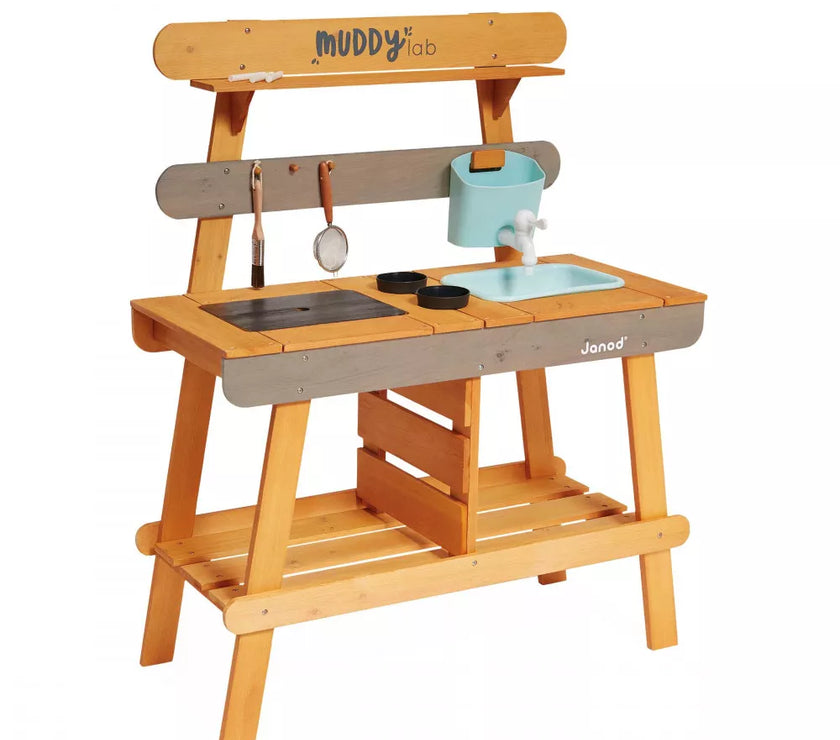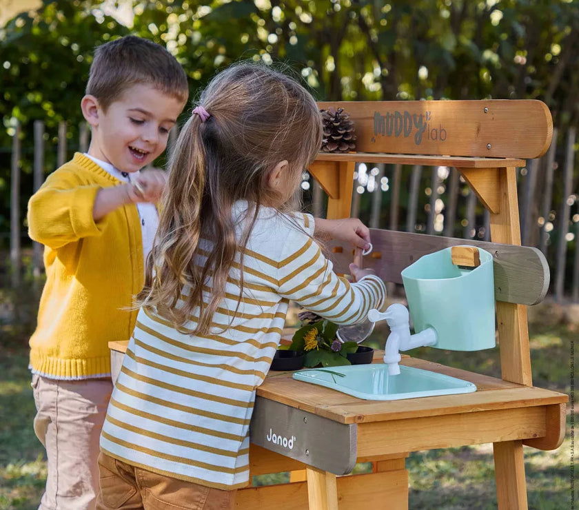 Et si on faisait de la cuisine au grand air avec ce Muddy Lab prêt à accueillir les enfants dès 3 ans pour tout un tas d'expériences en pleine nature ! Une fois l'emplacement idéal trouvé dans le jardin ou sur une terrasse, il n'y a plus qu'à mettre son imagination en action pour s'amuser avec la richesse de la nature et tout ce qui nous entoure ! Un peu de terre, quelques brins d’herbe, de l’eau, de jolies fleurs ... on mélange, on fait ses propres expériences, on observe et on apprend en s'amusant ! Et pourquoi ne pas préparer ses propres plantations sur cet établi d'extérieur ou table de rempotage ? On peut tout imaginer avec ce jouet d'imitation en pin spécialement traité pour l'extérieur. Ce véritable laboratoire de découverte de la nature est parfaitement équipé pour satisfaire tous les aventuriers des jardins grâce à ses 2 éviers et 2 petits pots amovibles en plastique permettant de partir à la recherche d'ingrédients de potions secrètes ! Un vrai robinet permet de passer au nettoyage facilement : il suffit de le remplir le bac puis d’ouvrir le robinet de droite à gauche pour laisser l’eau s’écouler ! Pour faciliter les recherches de votre petit explorateur, un tamis en métal et un pinceau sont également mis à sa disposition. Enfin, pour toutes ses découvertes, votre enfant disposera de 2 craies et d’une surface d’écriture amovible. Le plan de travail est situé à 56 cm de hauteur. Le Muddy Lab est fabriqué en bois FSC®. Le bois est une matière organique, par conséquent, certaines planches peuvent comporter des nœuds et des variations de teintes. A protéger des intempéries.