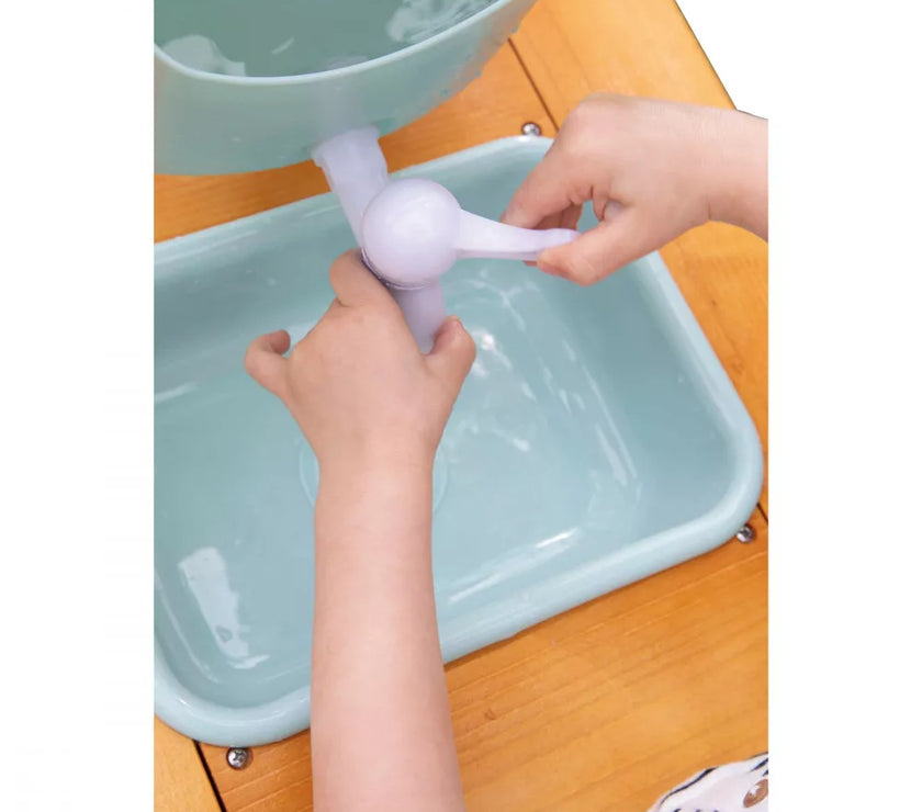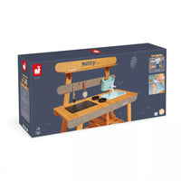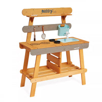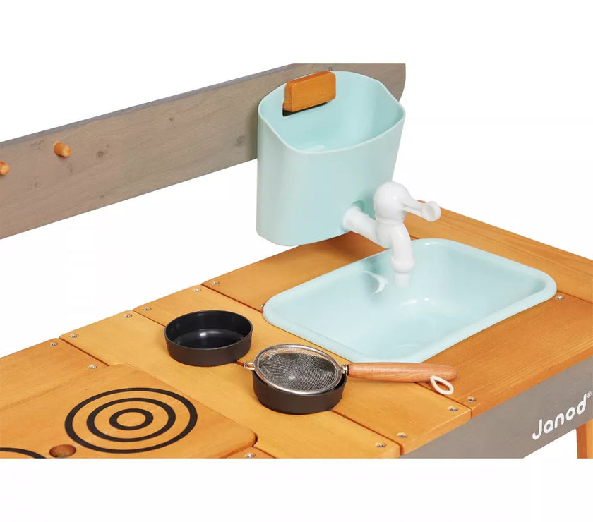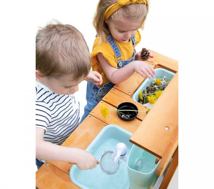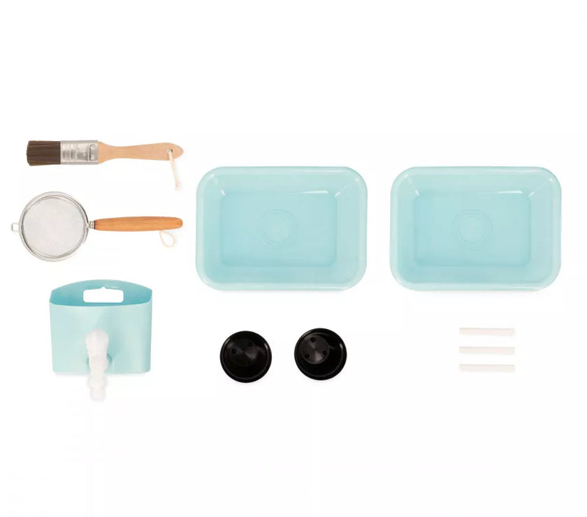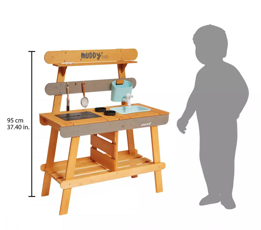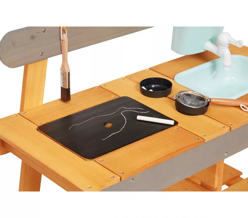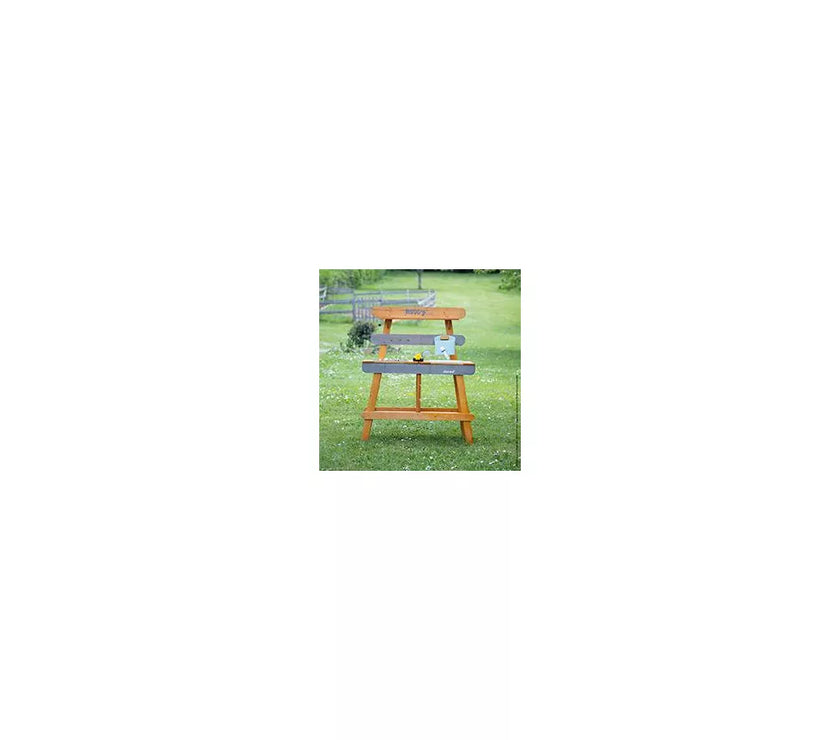 Et si on faisait de la cuisine au grand air avec ce Muddy Lab prêt à accueillir les enfants dès 3 ans pour tout un tas d'expériences en pleine nature ! Une fois l'emplacement idéal trouvé dans le jardin ou sur une terrasse, il n'y a plus qu'à mettre son imagination en action pour s'amuser avec la richesse de la nature et tout ce qui nous entoure ! Un peu de terre, quelques brins d’herbe, de l’eau, de jolies fleurs ... on mélange, on fait ses propres expériences, on observe et on apprend en s'amusant ! Et pourquoi ne pas préparer ses propres plantations sur cet établi d'extérieur ou table de rempotage ? On peut tout imaginer avec ce jouet d'imitation en pin spécialement traité pour l'extérieur. Ce véritable laboratoire de découverte de la nature est parfaitement équipé pour satisfaire tous les aventuriers des jardins grâce à ses 2 éviers et 2 petits pots amovibles en plastique permettant de partir à la recherche d'ingrédients de potions secrètes ! Un vrai robinet permet de passer au nettoyage facilement : il suffit de le remplir le bac puis d’ouvrir le robinet de droite à gauche pour laisser l’eau s’écouler ! Pour faciliter les recherches de votre petit explorateur, un tamis en métal et un pinceau sont également mis à sa disposition. Enfin, pour toutes ses découvertes, votre enfant disposera de 2 craies et d’une surface d’écriture amovible. Le plan de travail est situé à 56 cm de hauteur. Le Muddy Lab est fabriqué en bois FSC®. Le bois est une matière organique, par conséquent, certaines planches peuvent comporter des nœuds et des variations de teintes. A protéger des intempéries.