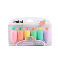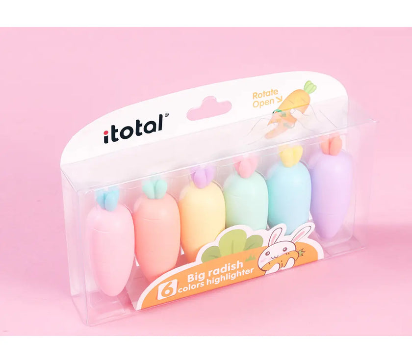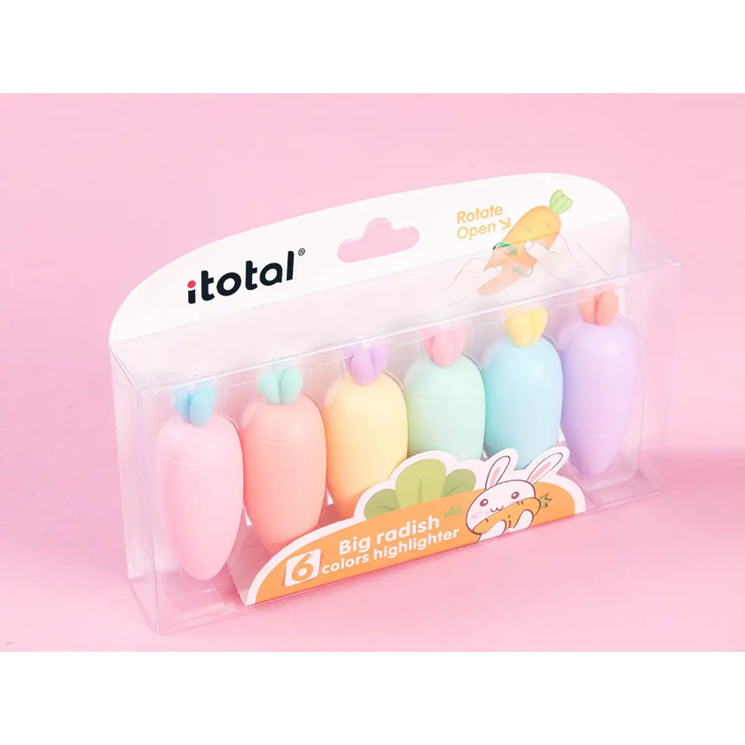 Ensemble de 6 marqueurs fluorescents de différentes couleurs et en forme de mignonnes carottes.