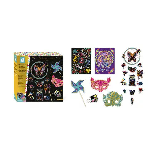 Voici un joli coffret Les Atelier du Calme, plein de belles activités autour du Scratch Art ! Cette technique de grattage permet de faire travailler la motricité fine des enfants tout en s'amusant et en réalisant de belles compositions. Le principe : A l'aide d'un stylet en bois, l'enfant gratte délicatement les supports aux endroits indiqués pour réveler de nouvelles couleurs ou illustrations, et ceci, comme s'il tenait un stylo. Dans ce coffret, retrouvez 8 créations à gratter puis à construire pour certaines : 2 tableaux, 2 masques pour se déguiser, 1 moulin à vent, 2 porte-clés et 1 attrape-rêves de 60 cm de haut. L'ensemble est très coloré avec des illustrations d'animaux extraordinaires ! Ce set de loisirs créatifs est un cadeau idéal pour les enfants à partir de 7 ans. Un livret pas à pas permet de réaliser chaque création en toute autonomie. Il faudra compter environ 6h au total pour réaliser les 8 activités.