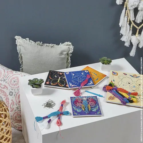 Ce kit créatif permet de réaliser 5 beaux portraits d'animaux en fils tendus (1 grand et 4 petits) en suivant le livret d'instructions pas à pas. Le coffret contient : 4 tableaux en mousse 12,5 x 12,5 cm, 1 tableau en mousse 25 x 25 cm, 800 clous, 10 échevettes de fils (7 m), 1 outil et un livret d'instructions. De jolies création pour décorer une chambre !
