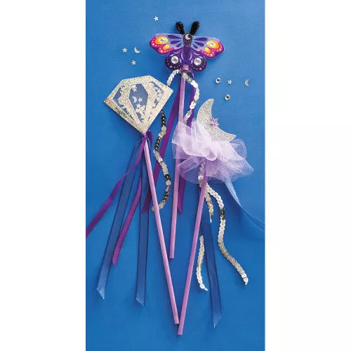 Ces baguettes vont vous ensorceler ! Avec ce kit créatif, les enfants dès 7 ans réalisent 3 baguettes magiques sur le thème des sorcières et magiciens. Pour enchanter les grimoires ou donner la touche finale à ses potions, il suffit d'un peu de magie ! Apprentis sorciers ou magiciennes mystérieuses seront ravis de compléter leurs déguisements ou de s'imaginer des tas d'histoires avec leurs propres baguettes. Ce coffret créatif permet aux enfants de développer leur imagination et leur créativité, mais aussi leur dextérité et leur précision. Sont présents dans le coffret : 1 planche prédécoupée pailletée argentée, 1 planche prédécoupée holographique, 1 planche prédécoupée imprimée, 1 planche prédécoupée transparente, de la tulle violette, 45 sequins étoiles et lunes, 6 sequins autocollants, 1 fil chenille noir, 3 baguettes en bois tinté, 1 ruban de sequins argentés, 2 rubans de satin (bleu et violet), 1 fil élastique et 3 carrés de mousse autocollante. Un livret avec modèles et instructions est aussi fourni, pour que les petits bricoleurs progressent à leur rythme. Les effets pailletés et les coloris oniriques immergent toute la famille dans un monde de sortilèges. Explorez les mystères de la magie avec la collection "Magic School", des kits de loisirs créatifs pour enfant sur le thème des apprenti(e)s sorcier(ère)s, pour des après-midis créatifs et enchantés !