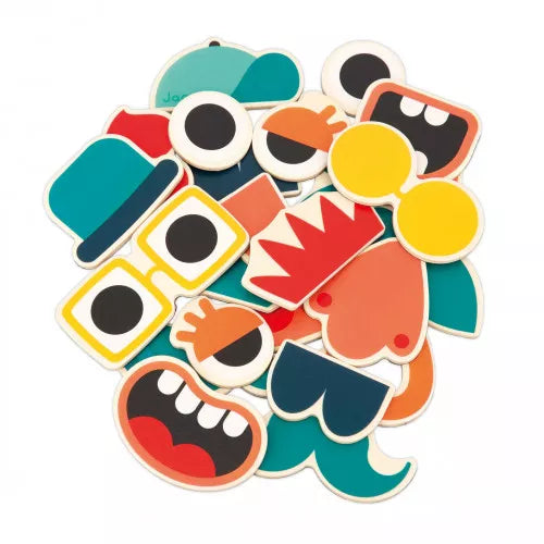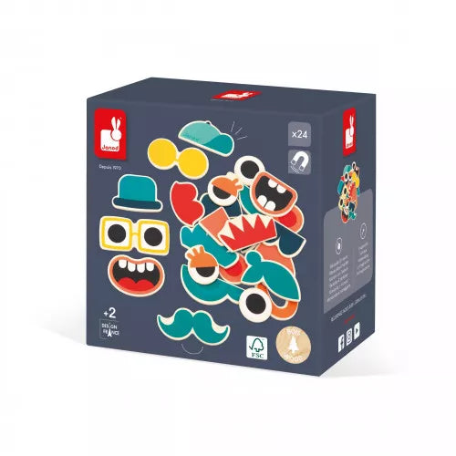 En voilà de drôles de têtes ! Avec ce lot de 24 magnets en bois, les enfants dès 2 ans vont pouvoir décorer toutes les surfaces aimantées ! Sur un tableau ou sur le réfrigérateur, ces magnets pour enfants font rire petits et grands ! 2 en 1, c'est aussi un jeu de mix & match : on choisit les yeux, les oreilles, on ajoute un chapeau et voilà un visage rigolo ! Ce set d'aimants en bois est idéal pour donner un côté fun aux photos de famille ou aux selfies affichés sur le réfrigérateur. Avec ces pièces aimantées, l'enfant décore ses dessins les plus farfelus sur son tableau et développe son imagination ! Mixez les expressions et imaginez des personnages amusants en famille ! Magnets en bois FSC®.