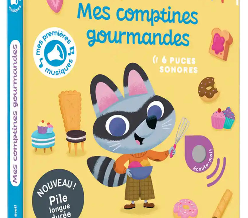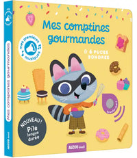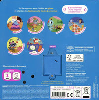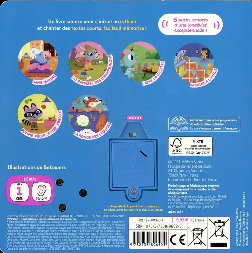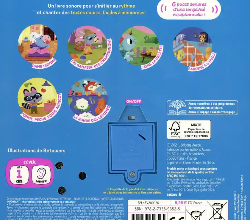 "Un livre tout-carton sonore pour écouter et danser sur 6 comptines bien connues en lien avec la nourriture Dame Tartine J'aime la Galette Pêche, pomme, poire, abricot Sardine à l'huile J'ai ramassé des champignons La ronde des légumes. "