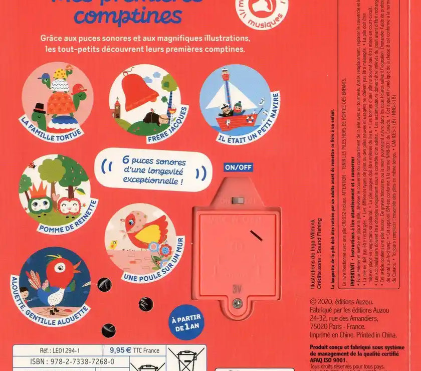Des livres sonores qui proposent 6 doubles pages et 6 sons. La longévité des piles est exceptionnelle : elle offre près de 5h d'écoute (versus 1h30 pour la majorité de la concurrence). Mes premiers musiques : Des comptines de l'enfance à écouter, mis en scène par des illustrations rondes et colorées ! Ici, on retrouve : La famille tortue, Frère Jacques, Il était un petit navire, Pomme de reinette, Alouette et Une poule sur un mur.
