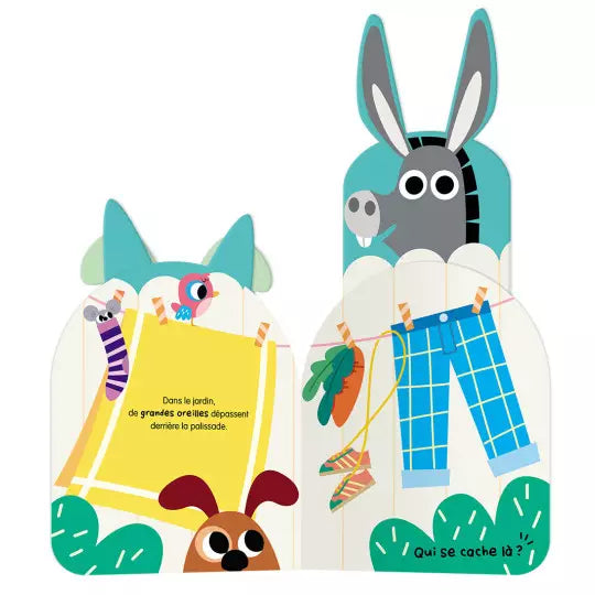 4 paires d’oreilles et 1 queue d’animal dépassent de ce livre animé en carte épaisse. Qui se cache là ? Tirer sur une paire d’oreilles fait « sortir » la tête de l’animal et déclenche un son : le cri de l’animal correspondant. Dans ce jeu de coucou-caché, le dernier animal se présente dans une posture rigolote. Il faut tirer sur la queue en tire-bouchon pour découvrir un cochon… la tête en bas ! Un livre animé solide, une thématique passion pour les plus petits, le fondamental jeu du coucou-caché, des surprises sonores et visuelles et un dernier animal encore plus rigolo que les précédents : le combo parfait pour les plus petits !