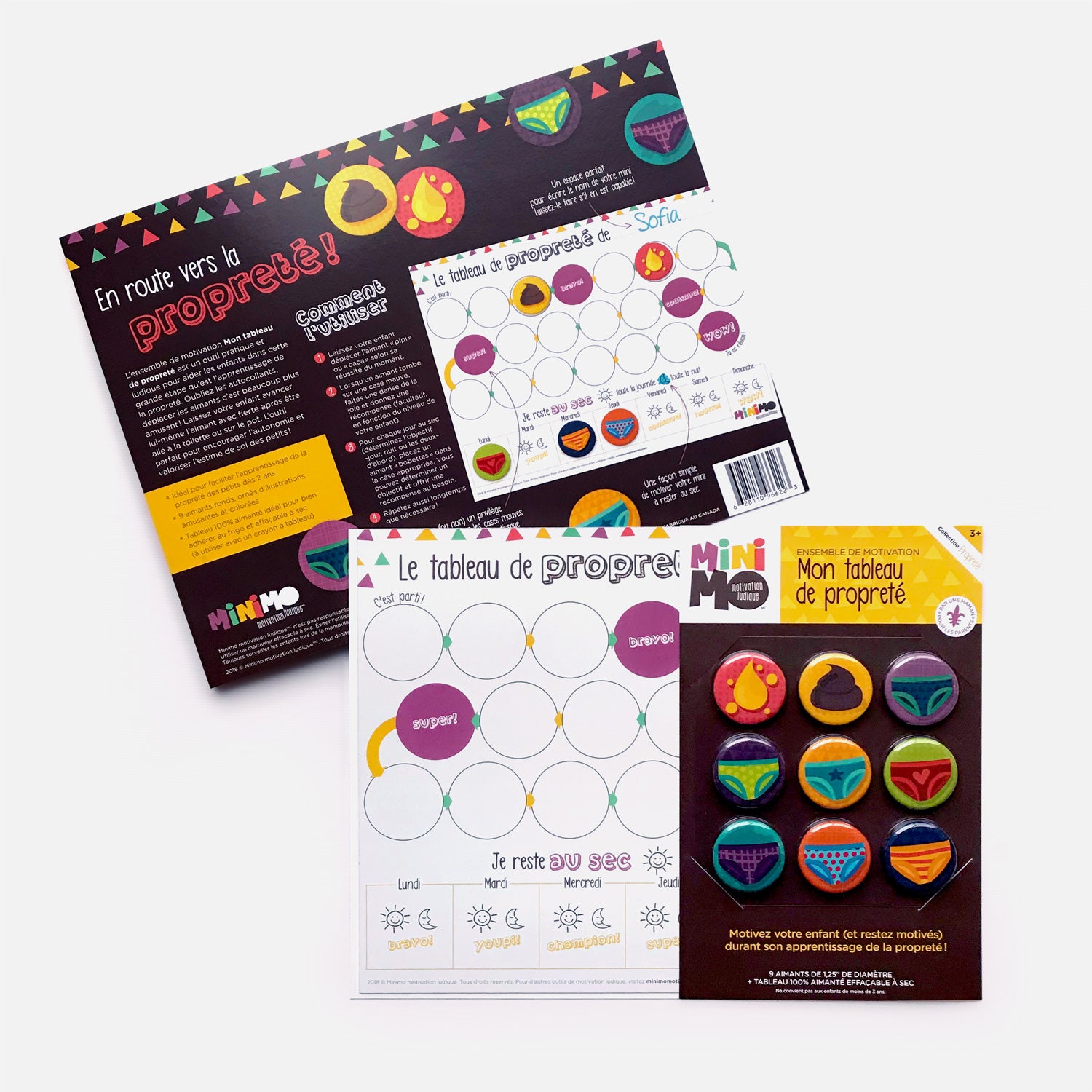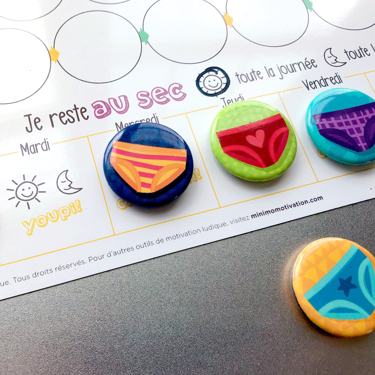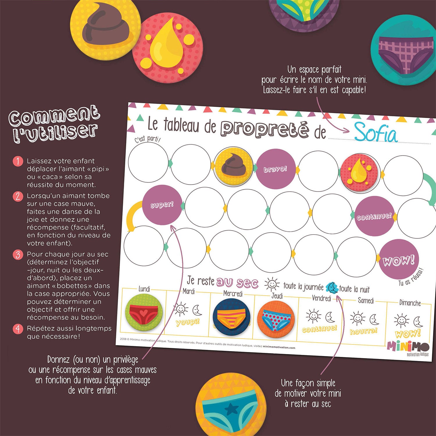 L’ensemble de motivationMon tableau de propretéest un outil pratique et ludique pour aider les enfants dans cette grande étape qu’est l’entraînement de la propreté. Oublie les autocollants, déplacer les aimants c’est beaucoup plus amusant! Laisse ton enfant avancer lui-même l’aimant avec fierté après être allé à la toilette ou sur le pot. L’outil parfait pour encourager l’autonomie et valoriser l’estime de soi des petits!
