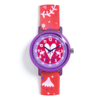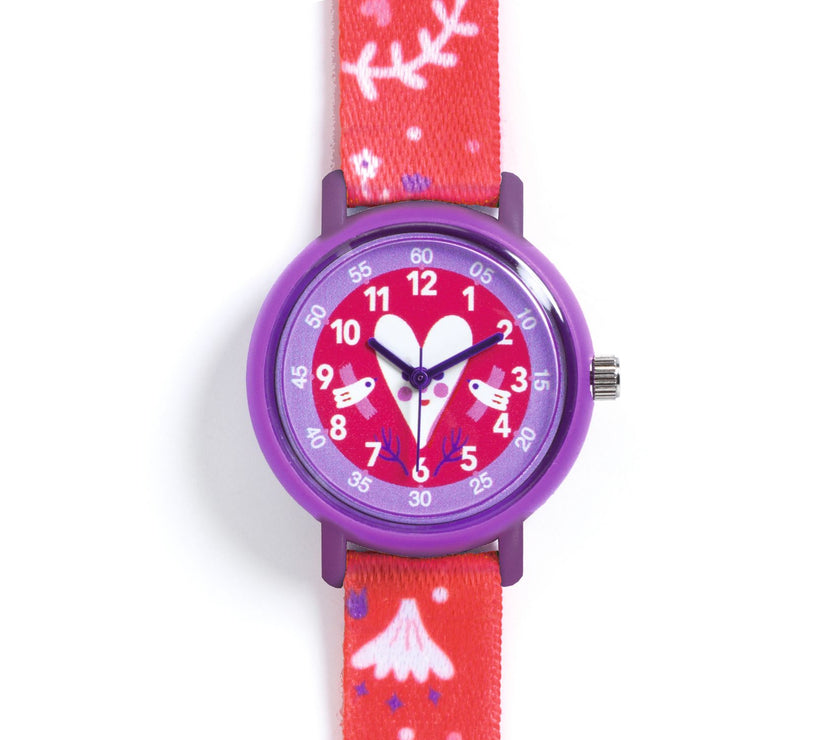 Une montre à quartz élégante et joliment illustrée d’un cœur pour apprendre à lire l’heure. Une montre pédagogique avec deux cadrans bien distincts (un pour les heures, l’autre pour les minutes) et des aiguilles fines pour faciliter la lecture de l’heure. Grâce au mouvement japonais Miyota 2035, le mouvement des aiguilles est silencieux. Une montre au boîtier antichoc et étanche jusqu’à 3 bar. Fonctionne avec 1 pile SR626SW fournie.
