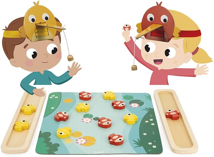 PÊCHE À LA LIGNE REVISITÉE: L'indémodable jeu de pêche aux canards dans une version très originale ! Le but du jeu est simple : chaque joueur place un oiseau sur sa tête à l'aide du bandeau élastique puis doit pêcher, grâce à un système d'aimant, les poissons de sa couleur préalablement disposés sur le plateau. Le tout, dans le temps imparti par le sablier. Qui sera le plus habile ?