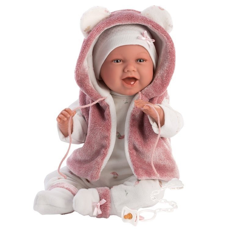 Quand tu pousses sur mon ventre, je ris et je crie "maman papa". Quand tu mets la tétine dans ma bouche, j'arrête de rire. Je peux bouger mes bras et mes jambes. J'ai un beau pyjama, un chapeau et une robe de chambre avec des oreilles.