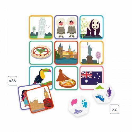 Qui a le plus de connaissances en monuments, animaux ou culture du monde ? Défiez-vous avec ce jeu de société qui vous demandera également de la rapidité de réflexion et d'action ! Au centre de la table 36 tuiles avec de jolies illustrations qui vous feront voyager. On lance 2 dés, l'un d'eux représente les continents, l'autre une catégorie. A vous d'associer le plus rapidement les 2 dés pour savoir ce qu'il va falloir retrouver sur la table. Le premier à taper sur la bonne tuile a gagné ! Ce jeu se compose de 36 tuiles recto-verso, de 2 dés avec chacun 6 dessins "continent" (Asie, Océanie, Afrique, Europe, Amérique du Sud et Amérique du Nord) et 6 "catégories" (Ville, Pays, Plat, Animal, Monument, Costume). La règle du jeu est uniquement disponible en français. Une partie dure environ 15 minutes et se joue de 2 à 4 joueurs. Ce jeu est Idéal pour les enfants à partir de 6 ans.