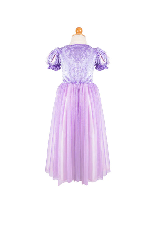 Libérez la magie d’un conte de fées avec larobe de princesse Il était une fois une tour douce et veloutée, inspirée de l’enchanteresse Raiponce ! La robe est dotée d’un magnifique haut en velours froissé violet, offrant une sensation luxueuse et veloutée. Les manches bouffantes à la Raiponce et la poitrine de style corset créent un look magnifique et royal, tandis que le décolleté en cœur est orné d’un bijou scintillant au centre pour une touche supplémentaire d’élégance.