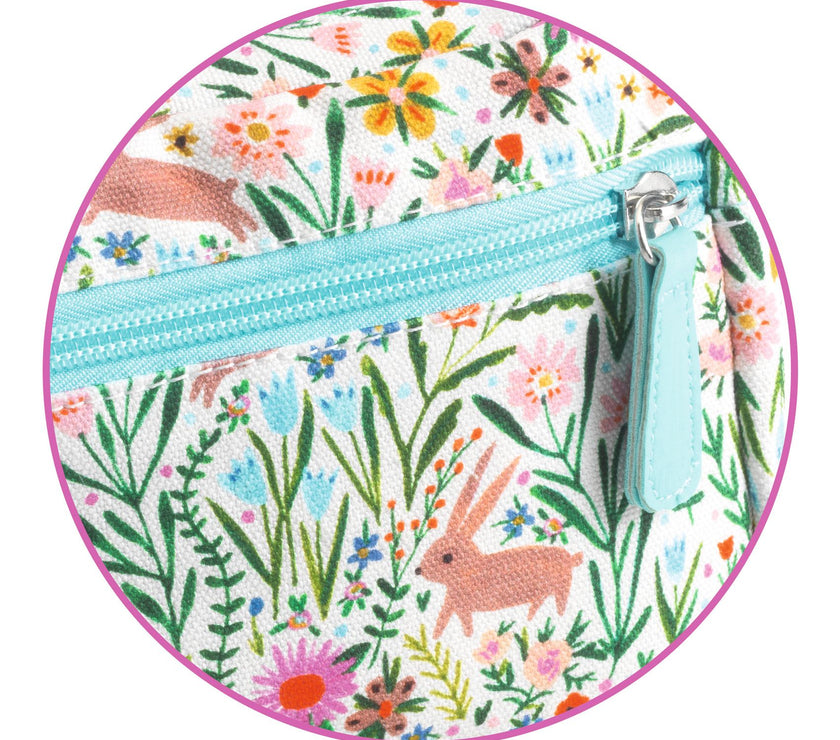 Un sac banane illustré sur le thème du lapin avec une grande poche centrale et une petite poche sur le devant. L’enfant peut le porter en bandoulière ou à la taille en fonction de son style.