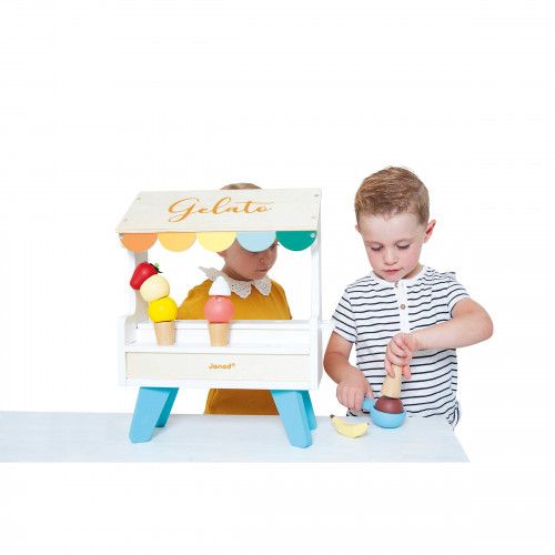 Plutôt glace à la vanille ou cornet à la fraise ? Goutez tous les parfums avec ce stand de glaces en bois ! Idéal pour les enfants dès 3 ans, ce jouet d'imitation rafraichissant promet de beaux moments de partage autour de délicieux cornets glacés. Il y a tout le nécessaire pour satisfaire les gourmands : 3 cônes, 6 boules de couleurs différentes, ainsi que des fruits et de la crème chantilly pour toujours plus de fantaisie ! Au total, 14 accessoires aimantés sont inclus : pratique pour ne pas faire tomber le contenu de son cornet. Toujours plus malin, la cuillère fournie est également magnétique et permet à nos petits vendeurs d'attraper facilement les boules de glace ! Une fois le client satisfait, on suspend la cuillère sur le côté de la marchande. Avec 6 emplacements pour présenter les glaces prêtes à emporter, le stand dispose aussi d'un espace de rangement à l'arrière. Avec cette marchande en bois, les petits jouent au glacier et imitent les plus grands, pour le plus grand bonheur de toute la famille ! Ce petit stand se pose facilement sur une table et favorise ainsi des moments de partage à plusieurs : il y en aura pour tout le monde ! Ce jouet d'imitation gourmand à souhait stimule aussi l'imagination des petits : et si la glace à la fraise était finalement goût bubble gum ? Il faut aussi être minutieux pour empiler soigneusement les éléments et faire preuve de créativité pour imaginer les compositions les plus attrayantes. Le stand est vendu avec tous ses accessoires et l'ensemble est fabriqué en bois FSC®.