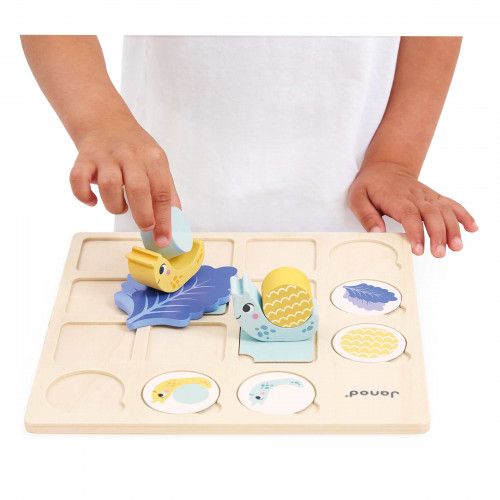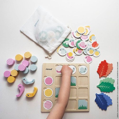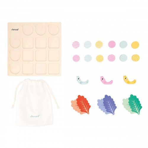 Voici une jolie manière de faire travailler la logique et l'observation aux enfants dès 4 ans ! Ce magnifique tableau à double entrée va permettre aux plus petits d'appréhender la notion de repères dans l'espace mais également d'apprendre un vocabulaire approprié : lignes, colonnes, cases ... et tout ceci en compagnie de beaux escargots colorés qu'ils vont eux-mêmes créer ! Sur le plateau en bois, on dispose 3 cartes coquilles en colonne et 3 cartes corps en ligne. But du jeu pour nos petits : croiser les informations et constituer l'escargot en associant le bon corps avec la bonne coquille. Un second niveau de difficulté est possible : il faudra placer l’escargot reconstitué sur la feuille de laitue de la bonne couleur ! 54 cartes rondes, 3 cartes carrées avec de l’herbe, 3 corps d’escargots, 12 coquilles et 3 feuilles de salade permettent de jouer avec une infinité de possibilités ! Pratique, un sac de rangement en coton est inclus pour ne rien perdre une fois le jeu terminé. Une notice explicative vous permettra d'utiliser au mieux ce jeu destiné aux enfants de moyenne et grande section de maternelle. Ce jeu fait partie de la gamme pédagogique Janod, développée en collaboration avec une professeure des écoles afin de coller au mieux aux apprentissages et aux programmes de chaque niveau. Il est fabriqué en bois et carton FSC®.